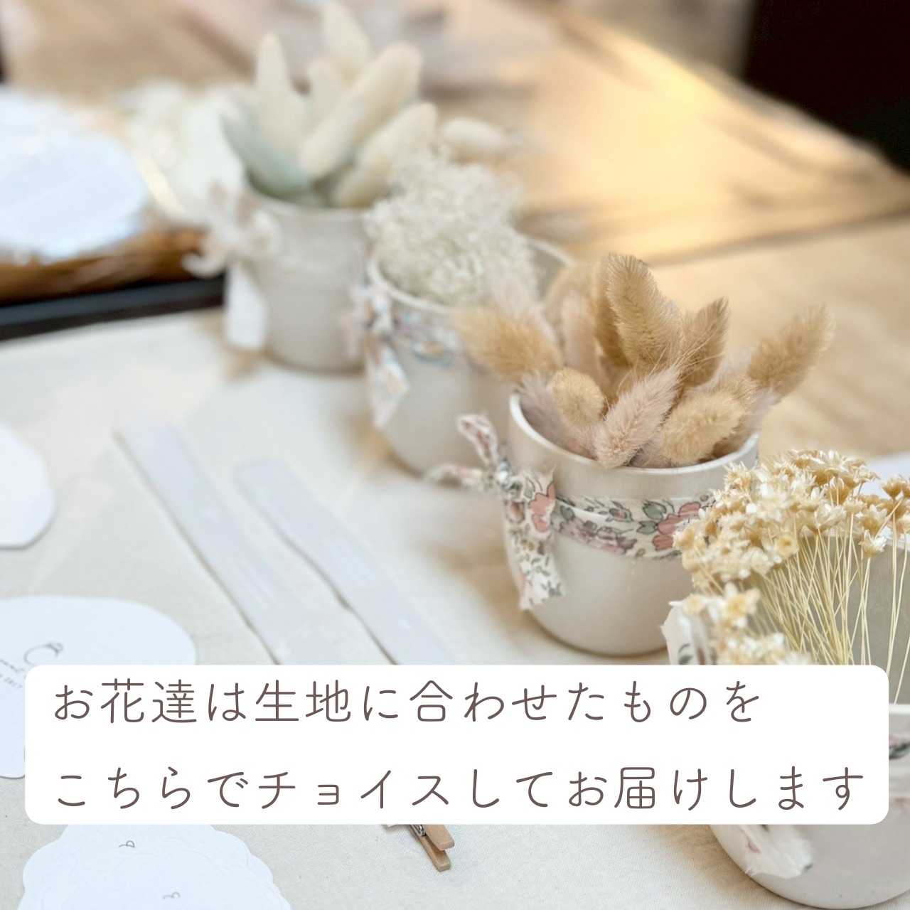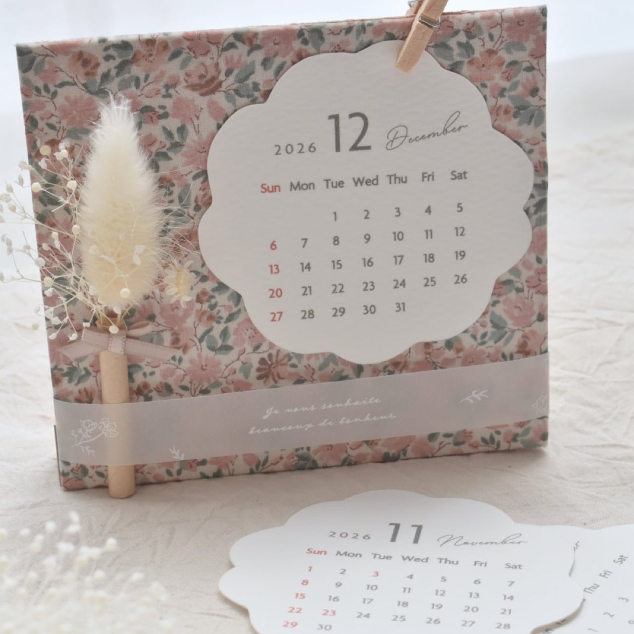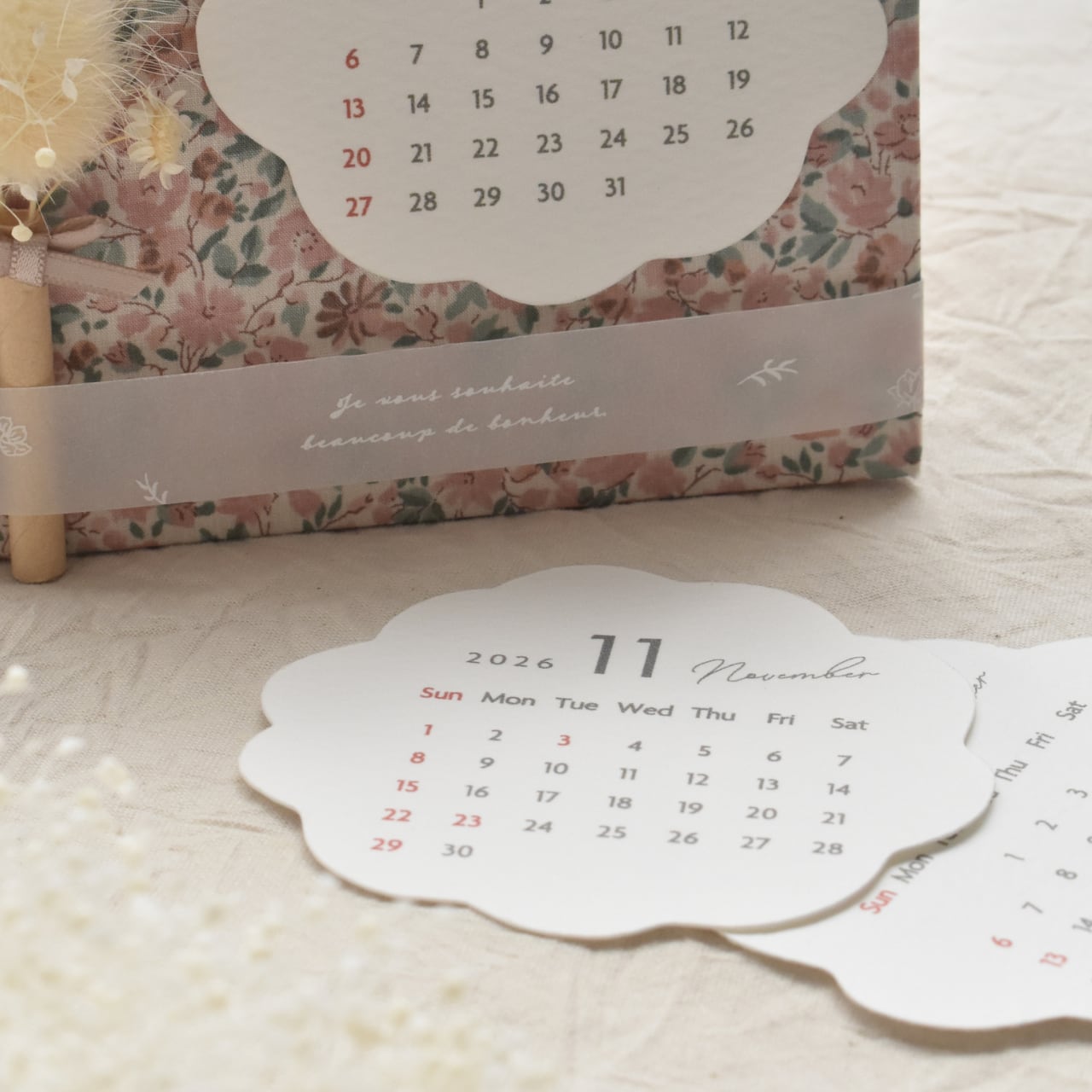 カレンダーのかたちに合わせて、生地とお花はこちらでチョイスしたものをお届けします。